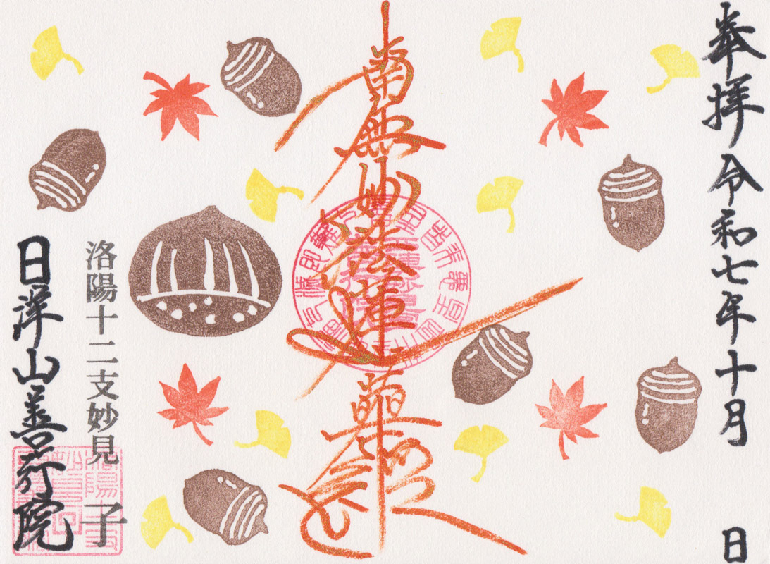 日蓮宗において重視する経典 法華経への信仰を表す「御題目(おだいもく)」を記したもの。日蓮宗寺院では御朱印とは区別し授与されています。令和7年10月に期間限定で授与できる御朱印です。