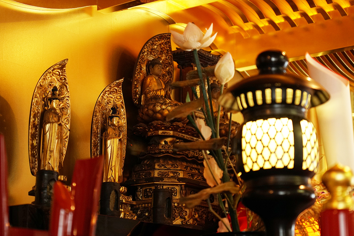 当院本堂の御本尊は一塔両尊四士(宝塔を中央に配し、その両脇に法華経の四菩薩である上行・無辺行・浄行・安立行を安置)です。