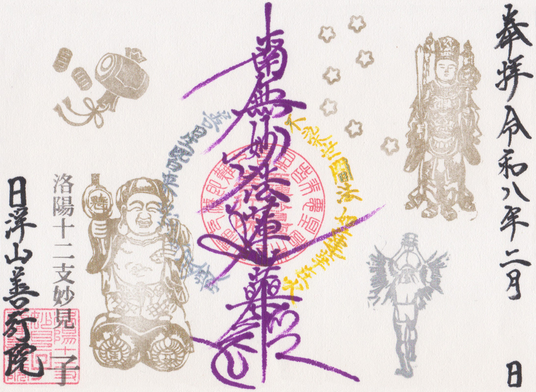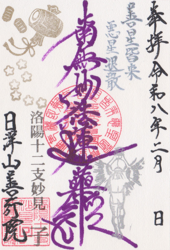 日蓮宗において重視する経典 法華経への信仰を表す「御題目(おだいもく)」を記したもの。日蓮宗寺院では御朱印とは区別し授与されています。尊星祭・大黒祭限定で授与できる御朱印です。